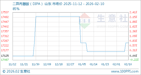 2月10日,生意社二异丙醇胺(DIPA)基准价为17250.00元/吨,与本月初(17166.67元/吨)相比,上涨了0.49%。