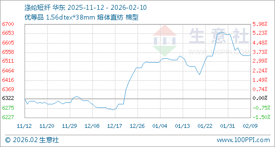 2月10日,生意社涤纶短纤基准价为6545.92元/吨,与本月初(6649.67元/吨)相比,下降了1.56%。