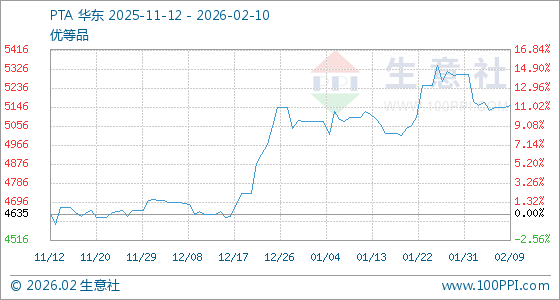 2月10日,生意社PTA基准价为5151.86元/吨,与本月初(5298.83元/吨)相比,下降了2.77%。