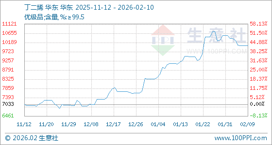 2月10日,生意社丁二烯基准价为10033.33元/吨,与本月初(10533.33元/吨)相比,下降了4.75%。