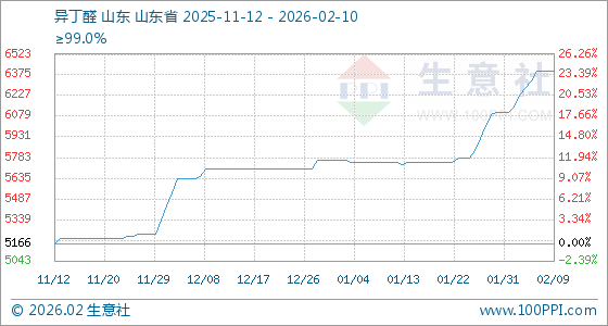 2月10日,生意社异丁醛基准价为6400.00元/吨,与本月初(6106.67元/吨)相比,上涨了4.80%。