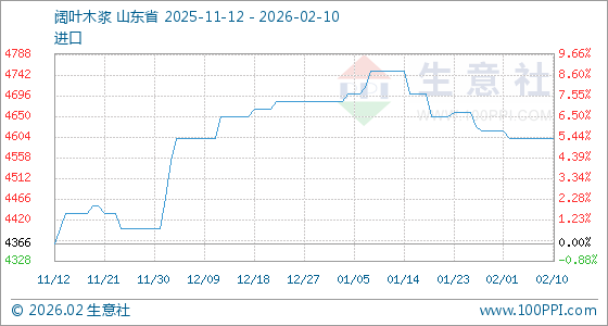 2月10日,生意社阔叶木浆基准价为4600.00元/吨,与本月初(4616.67元/吨)相比,下降了0.36%。
