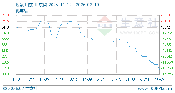 2月10日,生意社液氨基准价为2130.00元/吨,与本月初(2236.67元/吨)相比,下降了4.77%。