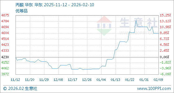 2月10日,生意社丙酮基准价为4600.00元/吨,与本月初(4700.00元/吨)相比,下降了2.13%。