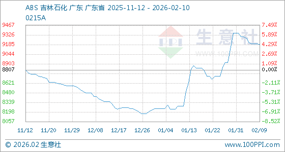 2月10日,生意社ABS基准价为9187.50元/吨,与本月初(9350.00元/吨)相比,下降了1.74%。