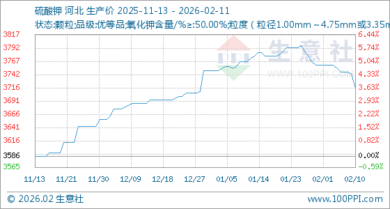 2月11日,生意社硫酸钾基准价为3716.67元/吨,与本月初(3760.00元/吨)相比,下降了1.15%。