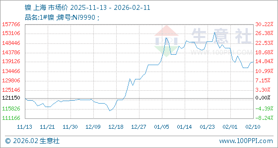 2月11日,生意社镍基准价为139250.00元/吨,与本月初(146016.67元/吨)相比,下降了4.63%。