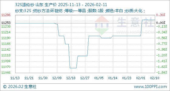 2月11日,生意社32S涤纶纱基准价为11266.67元/吨,与本月初(11200.00元/吨)相比,上涨了0.60%。