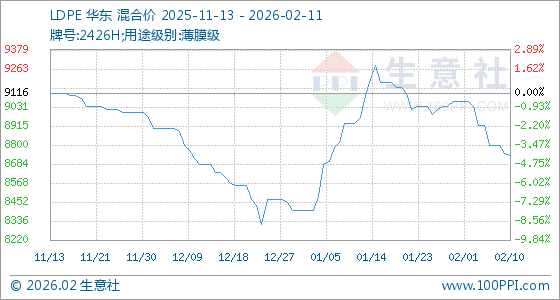 2月11日,生意社LDPE基准价为8733.33元/吨,与本月初(9066.67元/吨)相比,下降了3.68%。