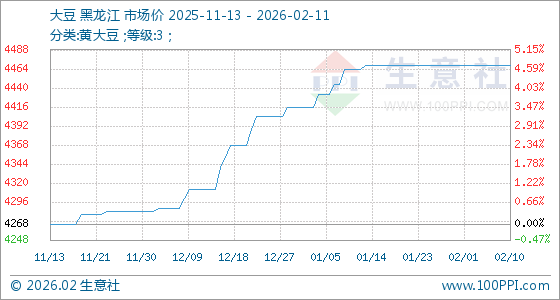 2月11日,生意社大豆基准价为4468.00元/吨,与本月初持平。