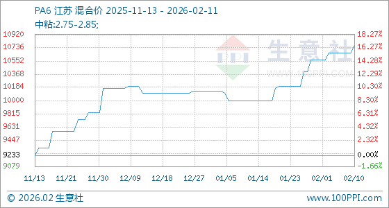 2月11日,生意社PA6基准价为10766.67元/吨,与本月初(10566.67元/吨)相比,上涨了1.89%。