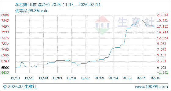 2月11日,生意社苯乙烯基准价为7678.00元/吨,与本月初(7874.00元/吨)相比,下降了2.49%。