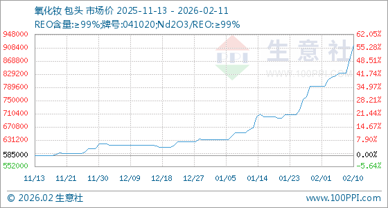 2月11日,生意社氧化钕基准价为915000.00元/吨,与本月初(792500.00元/吨)相比,上涨了15.46%。
