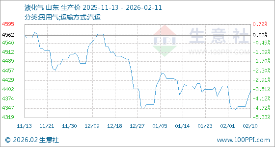 2月11日,生意社液化气基准价为4400.00元/吨,与本月初(4412.50元/吨)相比,下降了0.28%。