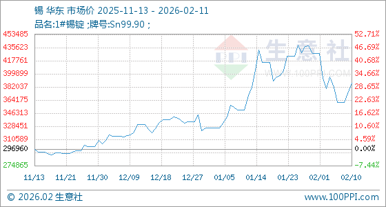 2月11日,生意社锡基准价为387490.00元/吨,与本月初(427370.00元/吨)相比,下降了9.33%。