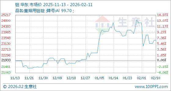 2月11日,生意社铝基准价为23406.67元/吨,与本月初(24666.67元/吨)相比,下降了5.11%。