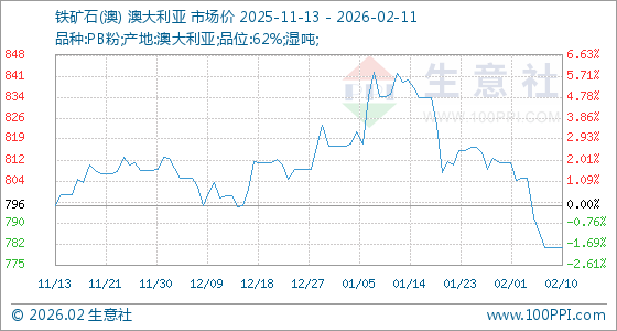 2月11日,生意社铁矿石(澳)基准价为781.44元/吨,与本月初(811.00元/吨)相比,下降了3.64%。