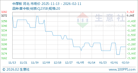2月11日,生意社中厚板基准价为3192.00元/吨,与本月初(3202.00元/吨)相比,下降了0.31%。