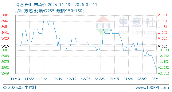 2月11日,生意社钢坯基准价为2970.00元/吨,与本月初(3020.00元/吨)相比,下降了1.66%。