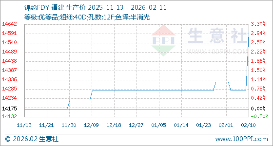 2月11日,生意社锦纶FDY基准价为14600.00元/吨,与本月初(14325.00元/吨)相比,上涨了1.92%。