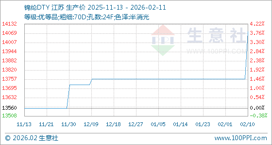 2月11日,生意社锦纶DTY基准价为14080.00元/吨,与本月初(13760.00元/吨)相比,上涨了2.33%。