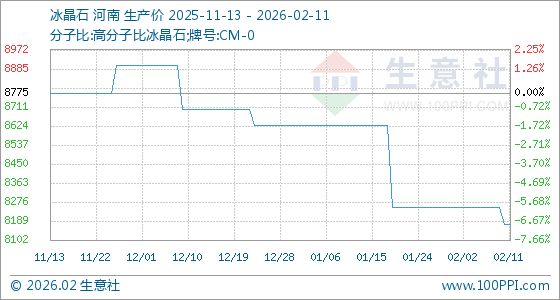 2月11日,生意社冰晶石基准价为8175.00元/吨,与本月初(8250.00元/吨)相比,下降了0.91%。
