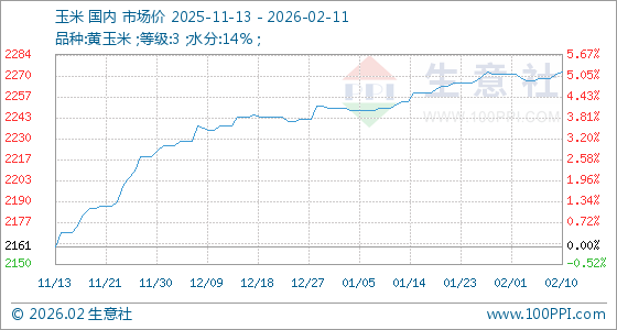 2月11日,生意社玉米基准价为2272.86元/吨,与本月初(2271.43元/吨)相比,上涨了0.06%。
