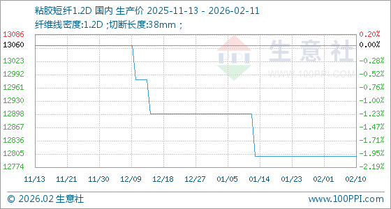 2月11日,生意社粘胶短纤1.2D基准价为12800.00元/吨,与本月初持平。