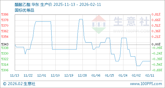 2月11日,生意社醋酸乙酯基准价为5320.00元/吨,与本月初(5326.67元/吨)相比,下降了0.13%。