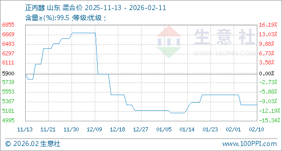 2月11日,生意社正丙醇基准价为5300.00元/吨,与本月初(5500.00元/吨)相比,下降了3.64%。
