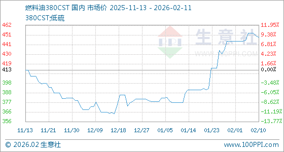 2月11日,生意社燃料油380CST基准价为449.00美元/吨,与本月初(445.00美元/吨)相比,上涨了0.90%。