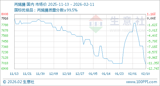 2月11日,生意社丙烯腈基准价为7000.00元/吨,与本月初(7650.00元/吨)相比,下降了8.5%。