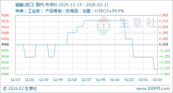 2月11日,生意社硼酸(进口)基准价为9000.00元/吨,与本月初(9033.33元/吨)相比,下降了0.37%。