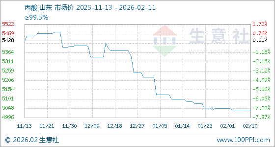 2月11日,生意社丙酸基准价为5040.00元/吨,与本月初(5046.25元/吨)相比,下降了0.12%。
