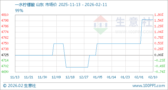 2月11日,生意社一水柠檬酸基准价为4800.00元/吨,与本月初(4750.00元/吨)相比,上涨了1.05%。