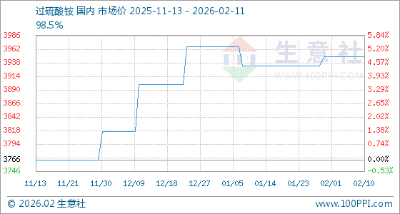 2月11日,生意社过硫酸铵基准价为3950.00元/吨,与本月初持平。