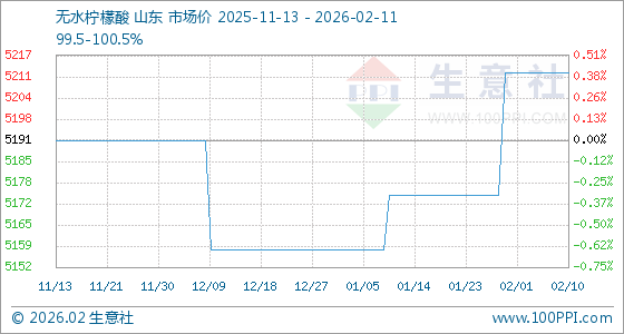2月11日,生意社无水柠檬酸基准价为5212.50元/吨,与本月初持平。