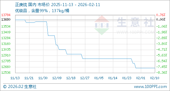 2月11日,生意社正庚烷基准价为12640.00元/吨,与本月初持平。