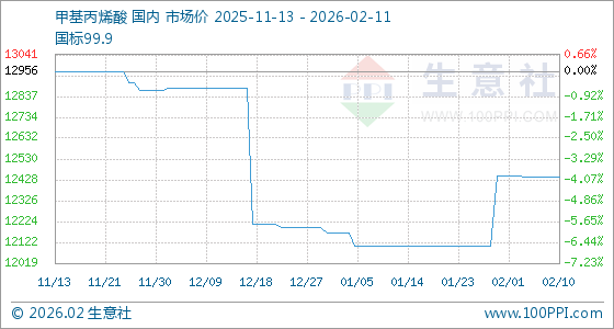 2月11日,生意社甲基丙烯酸基准价为12440.00元/吨,与本月初(12448.57元/吨)相比,下降了0.07%。