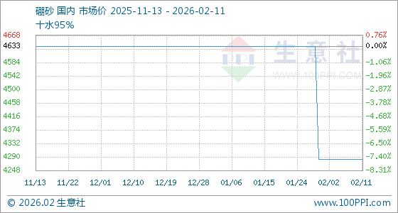 2月11日,生意社硼砂基准价为4283.33元/吨,与本月初持平。