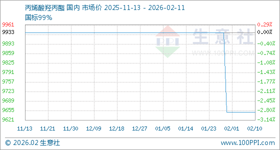 2月11日,生意社丙烯酸羟丙酯基准价为9650.00元/吨,与本月初持平。