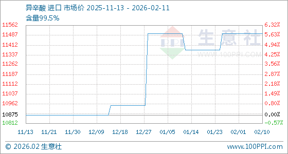 2月11日,生意社异辛酸基准价为11500.00元/吨,与本月初持平。