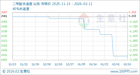 2月11日,生意社二甲胺水溶液基准价为2000.00元/吨,与本月初持平。