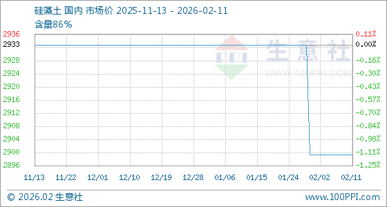 2月11日,生意社硅藻土基准价为2900.00元/吨,与本月初持平。