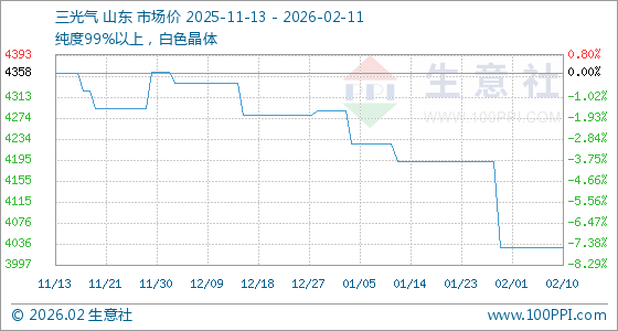 2月11日,生意社三光气基准价为4030.00元/吨,与本月初持平。