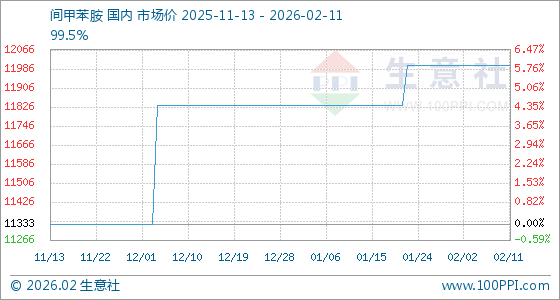 2月11日,生意社间甲苯胺基准价为12000.00元/吨,与本月初持平。