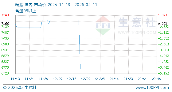 2月11日,生意社精萘基准价为6766.67元/吨,与本月初持平。