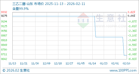 2月11日,生意社三乙二醇基准价为8700.00元/吨,与本月初(8966.67元/吨)相比,下降了2.97%。