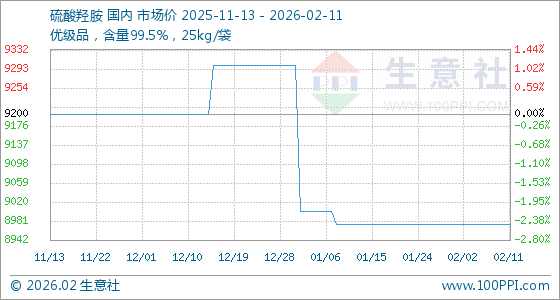 2月11日,生意社硫酸羟胺基准价为8975.00元/吨,与本月初持平。