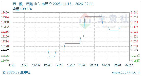 2月11日,生意社丙二酸二甲酯基准价为12325.00元/吨,与本月初(12300.00元/吨)相比,上涨了0.20%。